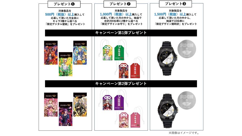 AXEと『逆転オセロニア』のコラボレーションを記念し、限定グッズが当たるキャンペーンを開催。第1弾では、AXE製品の購入金額に応じて、ジェンイー、ジークフリート、デネヴの3キャラクターをデザインした限定オリジナルグッズをプレゼント。第2弾では、キャラクターが変わり、アンドロメダ、夜行、ファヌエルに加え、ゲーム内でも人気を誇るアズリエルの限定描き下ろしグッズをプレゼントいたします。