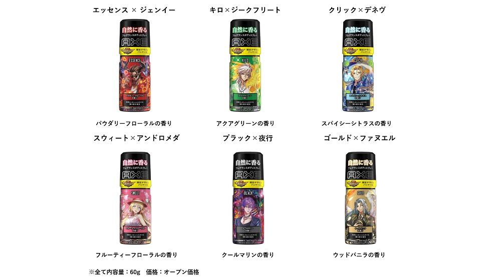 コラボレーション限定パッケージのアックス フレグランス ボディスプレーは、逆転オセロニアのキャラクターを、アックス フレグランス ボディスプレー全6種類のパッケージカラーや香りをモチーフに描き下ろした特別仕様で販売しております。