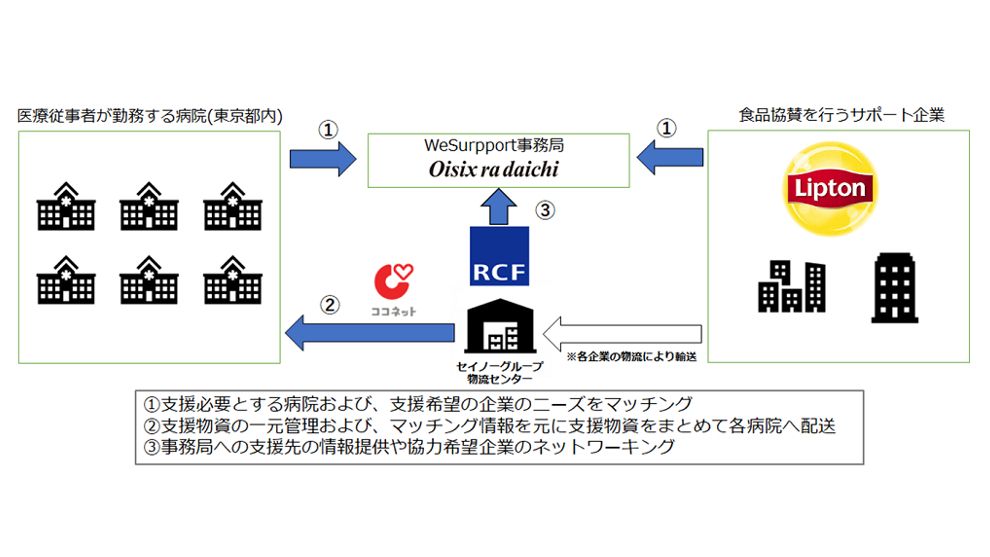ユニリーバ・ジャパン・カスタマーマーケティング株式会社(本社:東京都目黒区、代表取締役プレジデント&CEO:サンジェイ・サチュデヴァ)が展開する紅茶ブランド「リプトン」は、5月18日(月)より、一般社団法人RCF、オイシックス・ラ・大地株式会社、ココネット株式会社(セイノーホールディングスグループ)が連携して運営する、新型コロナウイルス感染症の予防や治療にあたる医療従事者への食品の無償支援を行うプラットフォーム「WeSupport」に対し、紅茶製品の無償提供を実施しました。なお、感染拡大防止と病院側の受け取り負担軽減のため非対面による配送を予定しています。 「WeSupport」は、現在東京都の感染症指定医療機関を中心に、全24カ所の医療機関を対象に支援を行っており、今後順次対象医療機関を増やしていく予定です。