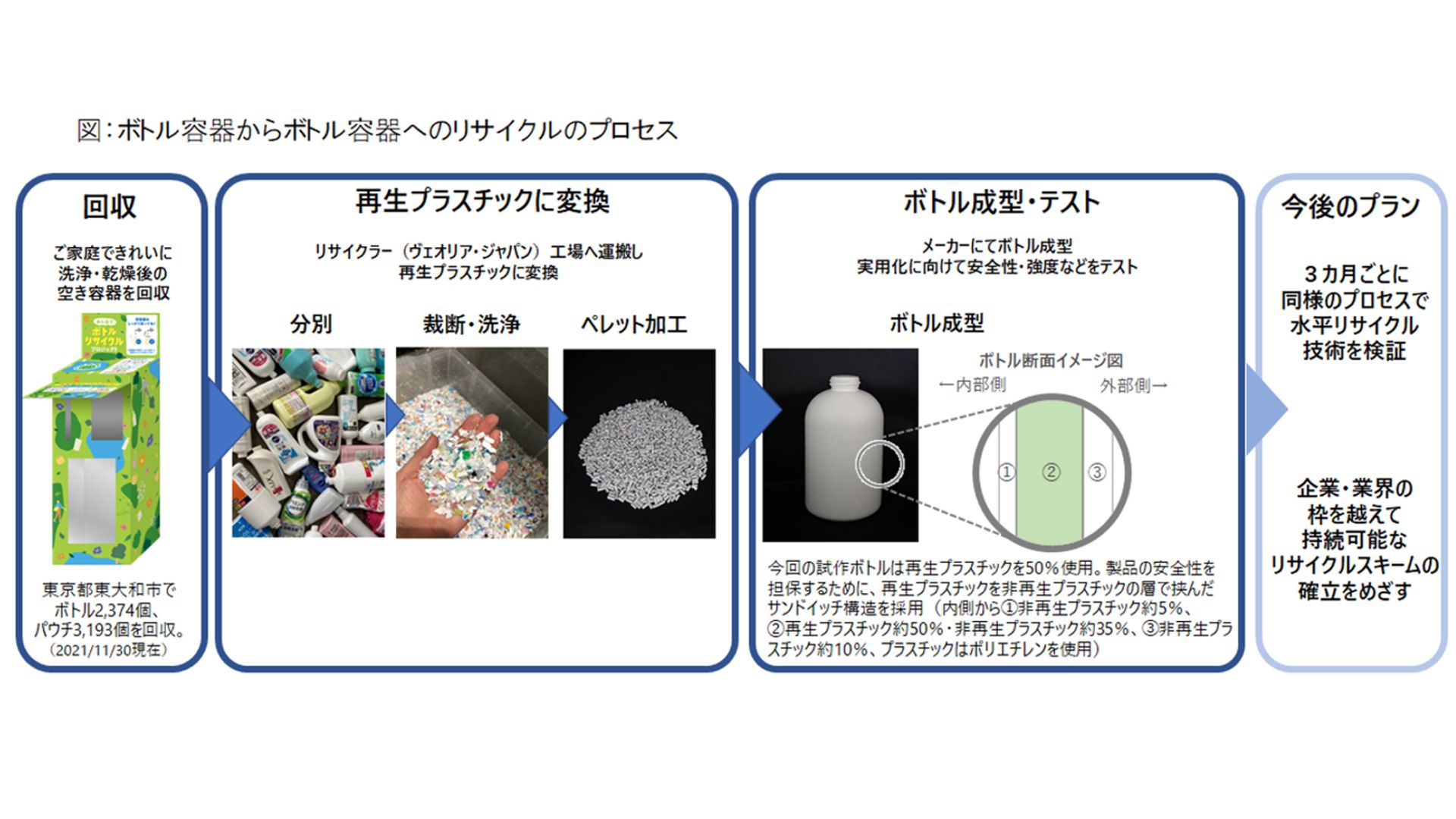 また、ボトル容器の加工成型にも成功しました。成型したボトルは、製品の安全性を担保するために、再生材を約50%使用したもので作られています。今後も3カ月ごとに同様のプロセスを経て、ボトル容器からボトル容器への水平リサイクル技術の検証を進めていく予定です。