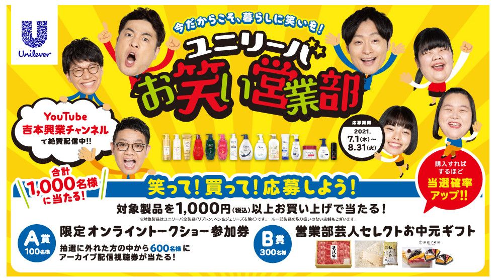 キャンペーン期間中、ユニリーバの対象製品を1,000円(税込)以上お買い上げの上、ウェブまたははがきでご応募いただいた方の中から抽選で合計1,000名様に、ここでしか見られない限定オンライントークショーの参加券や、営業部芸人セレクトのお中元ギフトをプレゼントします。さらに、YouTube吉本興業チャンネルでは、ユニリーバ製品を営業部芸人が面白楽しく紹介するオリジナル動画を大公開!今だからこそ、暮らしに必要な笑いをお届けしていきます。たくさんのご応募をお待ちしております。