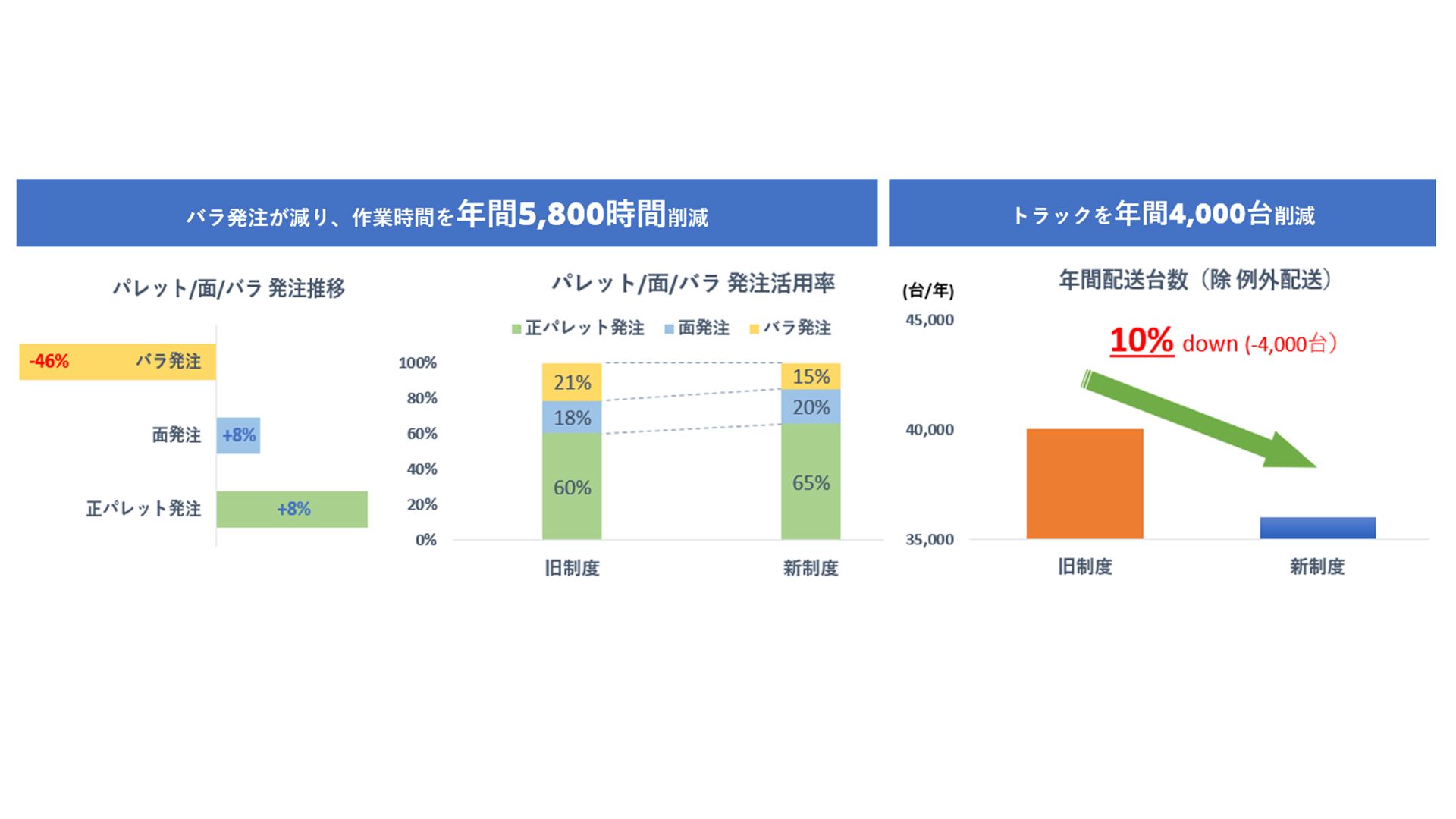 すべてのお取引先さま、すべての製品を対象に、トラックが隙間なく積める量の製品をご発注いただけると割引になる「満車割」、ケース単位ではなくパレット単位でご発注いただけると割引になる「パレット割」、1週間以上前にご発注いただけると割引になる「早期発注割」を導入しました。トラック満車単位だと輸配送に必要なトラックの台数を減らせます。パレット単位だとトラックにケースを一つひとつ手で積む必要がなく、トラックドライバーの作業時間や負担を減らせます。 - 日用品・化粧品大手初!すべての発注を翌々日以降配送へ変更
