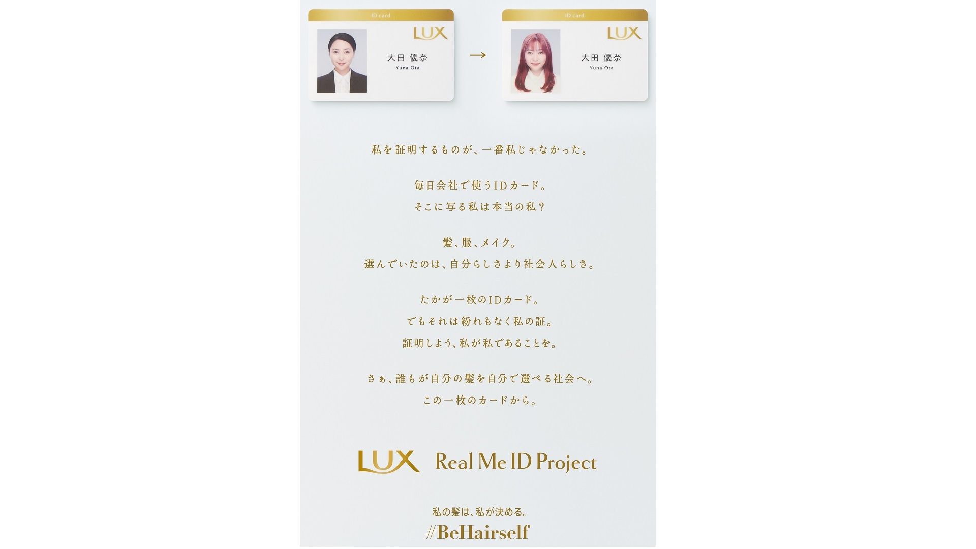 ブランドビジョンである「LUX BRAVE VISION 2030」を掲げるラックスは「髪の偏見に関する調査(n=800)」を実施し、2人に 1人が周りの目を気にして自分のしたい髪型を諦めていた※1ことが明らかとなりました。それに伴い、ひとりひとりのヘアオートノミー〈髪の自己決定権〉を取り戻すべく、新たにブランドスローガンとして「#BeHairself 私の髪は、私が決める。」を 3 月に発表。今回はそのブランドスローガンの最初のアクションとして「Real Me ID Project」を 4月3 日(月)より始動します。
