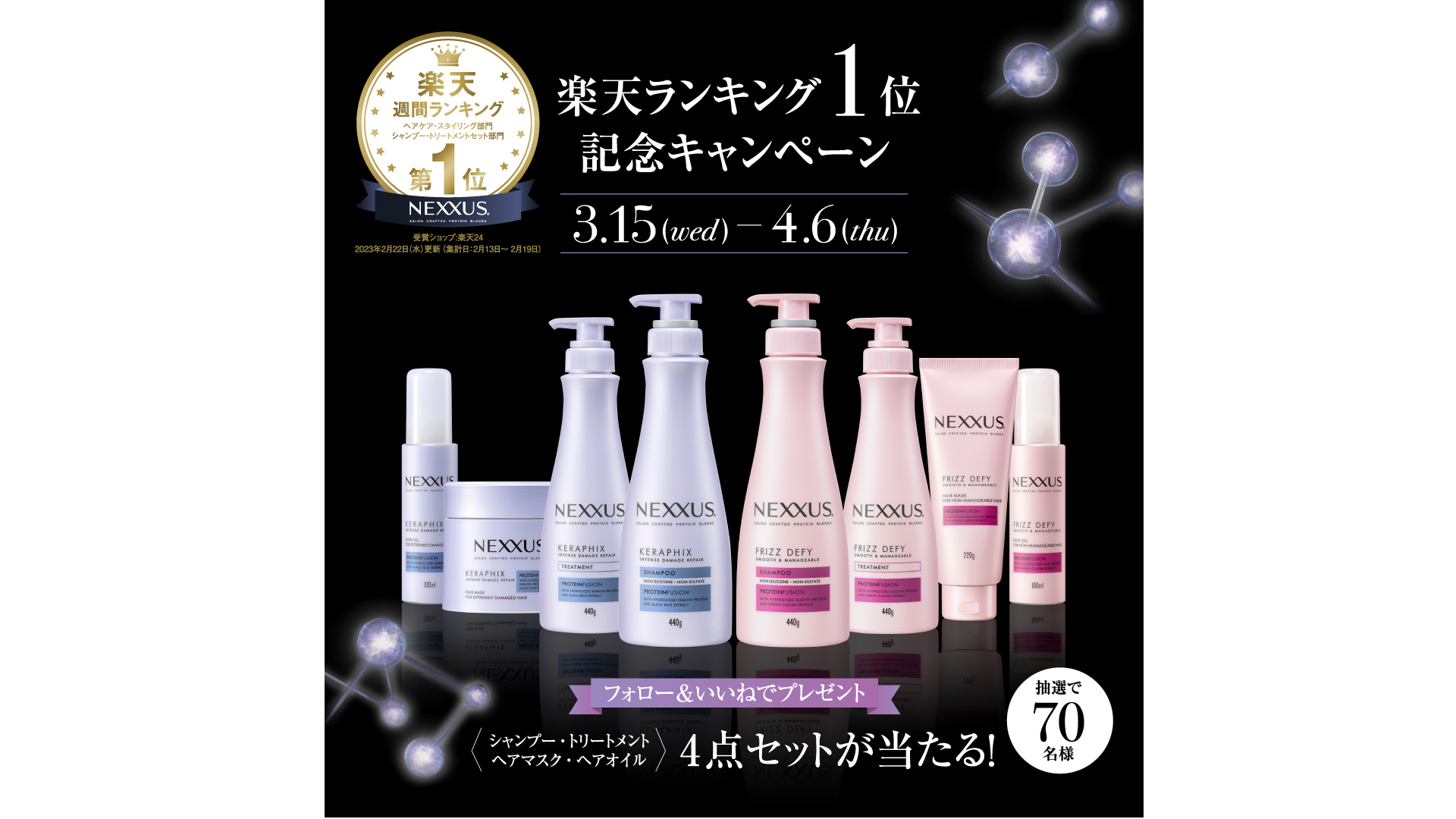 「NEXXUS」は2月15日(水)より楽天にて先行発売を開始。約1週間で完売を記録しています。さらに2023年2月13日(月)~2月19日(日)における楽天週間ランキングにおいては「ヘアケア・スタイリング部門」・「シャンプー・トリートメントセット部門」の2部門にて、売上1位※を獲得しました。 このランキング1位獲得を記念し、3月15日(水)より、プレゼントキャンペーンの開始も決定いたしました。