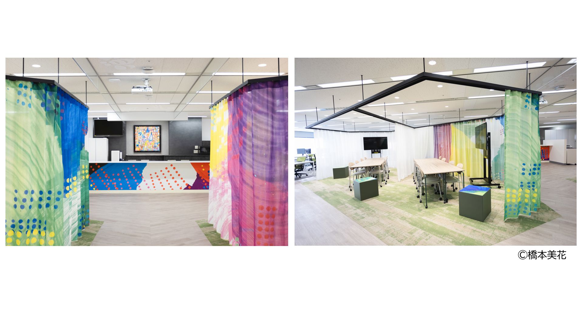 新たな文化の創出をめざす株式会社ヘラルボニー(本社:岩手県盛岡市)が契約する異彩作家のアート作品をオフィスに展示するとともに、執務エリア中央のカーテンやスツール、カウンターにもあしらい、ユニリーバが大切にしているEDIを体感できるようにしました。