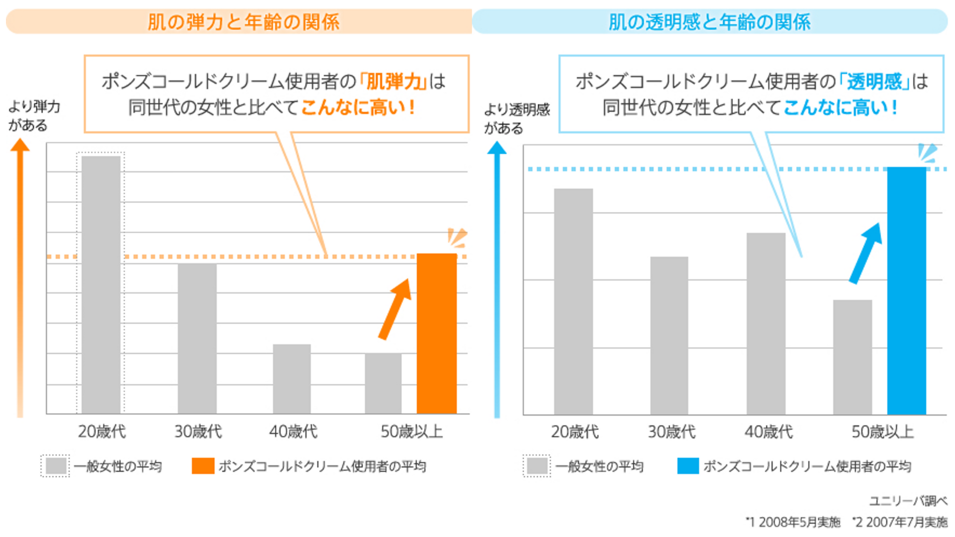 ポンズ コールドクリーム(ふきとりタイプ)を使い続けた女性は、同世代の女性と比べて、肌の弾力や透明感が高い!!