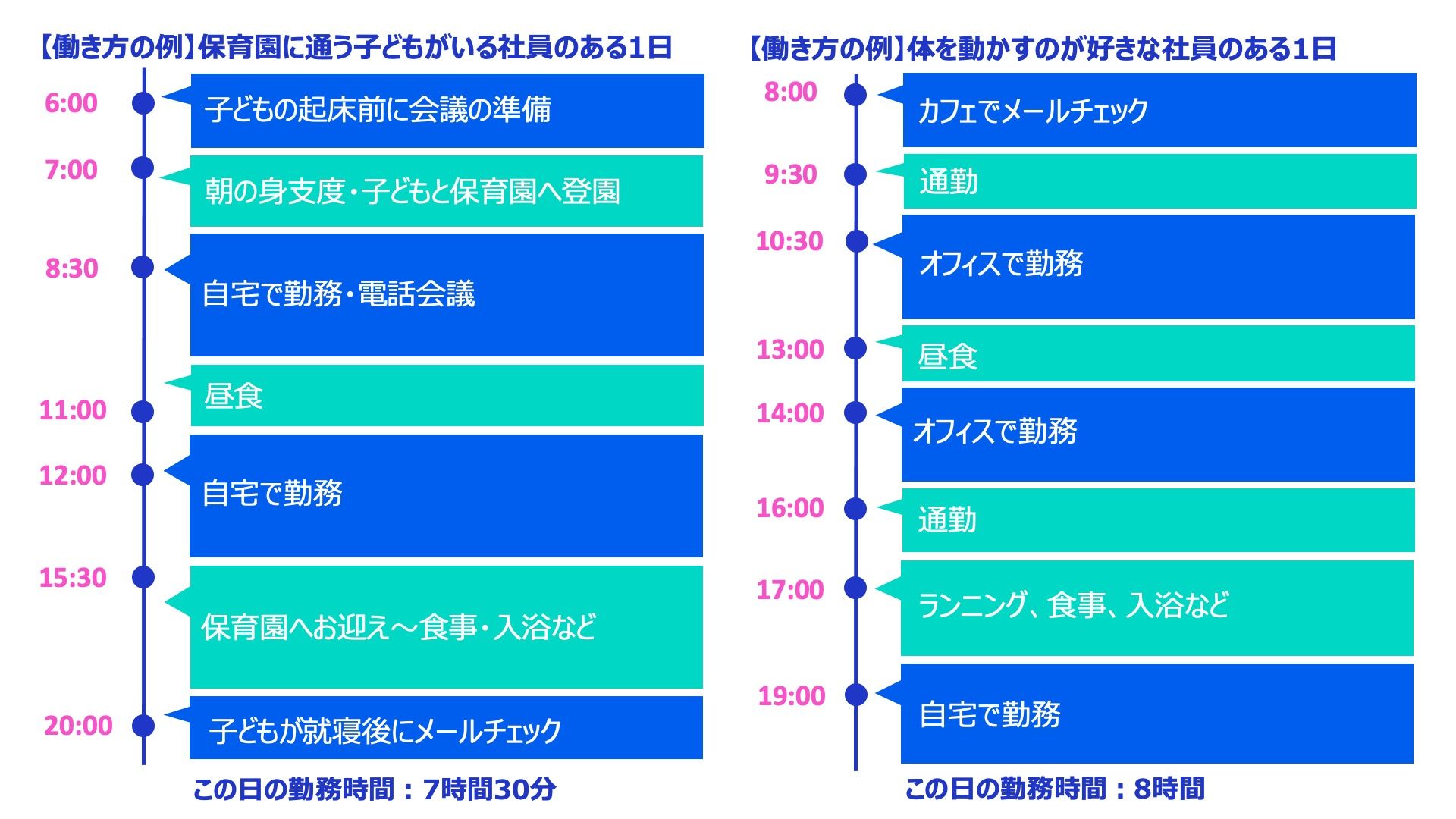 「自分が最も生産性があがる時間に出社でき仕事がはかどる。日中私用で気軽に外出できて1日が充実する」
